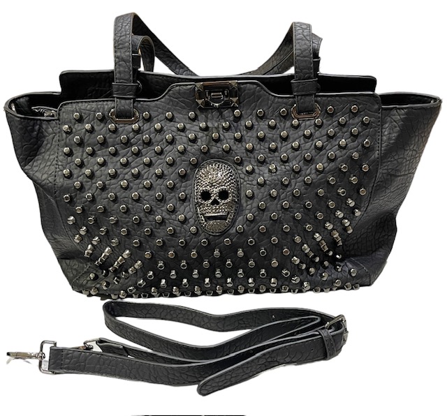 Iso olkalaukku niiteillä, musta. Keinonahkaisen laukun etuosa on somistettu niiteillä sekä isolla metallisella pääkallolla. Takaosassa on vetoketjutasku ja sen ketjussa metallinen kallovedin. Laukussa on kiinteät käsihihnat sekä lisäksi irroitettava olkahihna. Laukku suljetaan vetoketjulla ja vetoketjun kiinnityksen jälkeen on mahdollista yhdistää laukun yläreunat vielä klipsulla. Vuorikangas on mustavalkoista, pääkallokuvioista kangasta. Vuorissa on sekä vetoketjutasku, että kaksi avotaskua pikkutavaroille. Mitat 37 x 25 x 11,5 cm.
