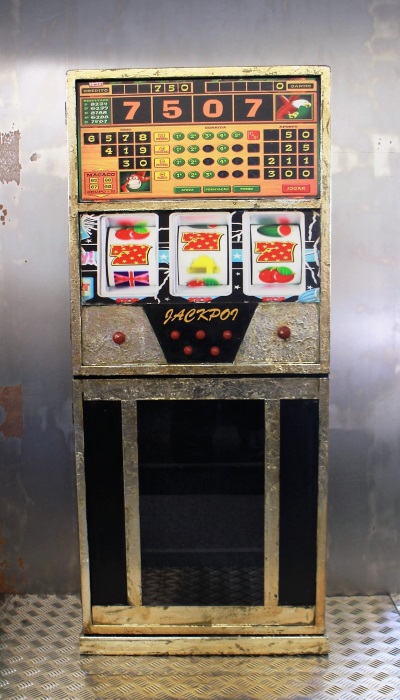 JACKPOT ! Mahtava erikoisuus ! Vanhan kolikkopelikoneen näköinen kaappi, Las Vegas fiilistä ! Sopii esim. kenkäkaapiksi tai pelihuoneen somisteeksi. Valmistettu MDF-levystä. Koko 61 x 33 x 140 cm, paino 24 kg.