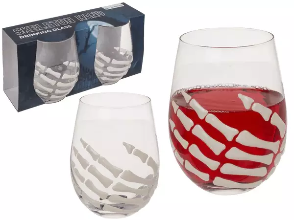 Juomalasi Skeleton Hand 2 kpl. Kaksi luurangon sormilla somistettua juomalasia pakkauksessa. Käsinpesu.