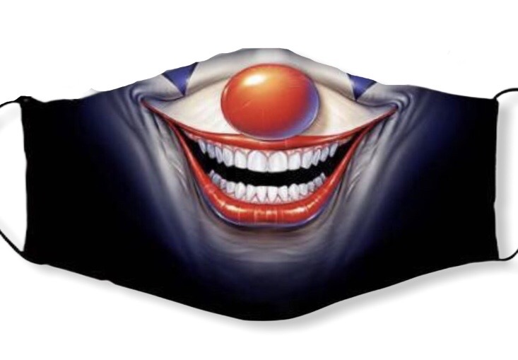 Maski Clown. Pimeässä hohtava kankainen 3-kerrosmaski 3D-painatuksella. Maskissa on säädettävät joustavat korvalenkit. Nenän päältä muotoiltavissa sopivaan muotoon omalle nenälle. Extrana myös tasku mahdolliselle filtterille (ei sisälly pakkaukseen, eikä kuulu meidän valikoimaamme). Materiaali 100 % puuvillaa.
