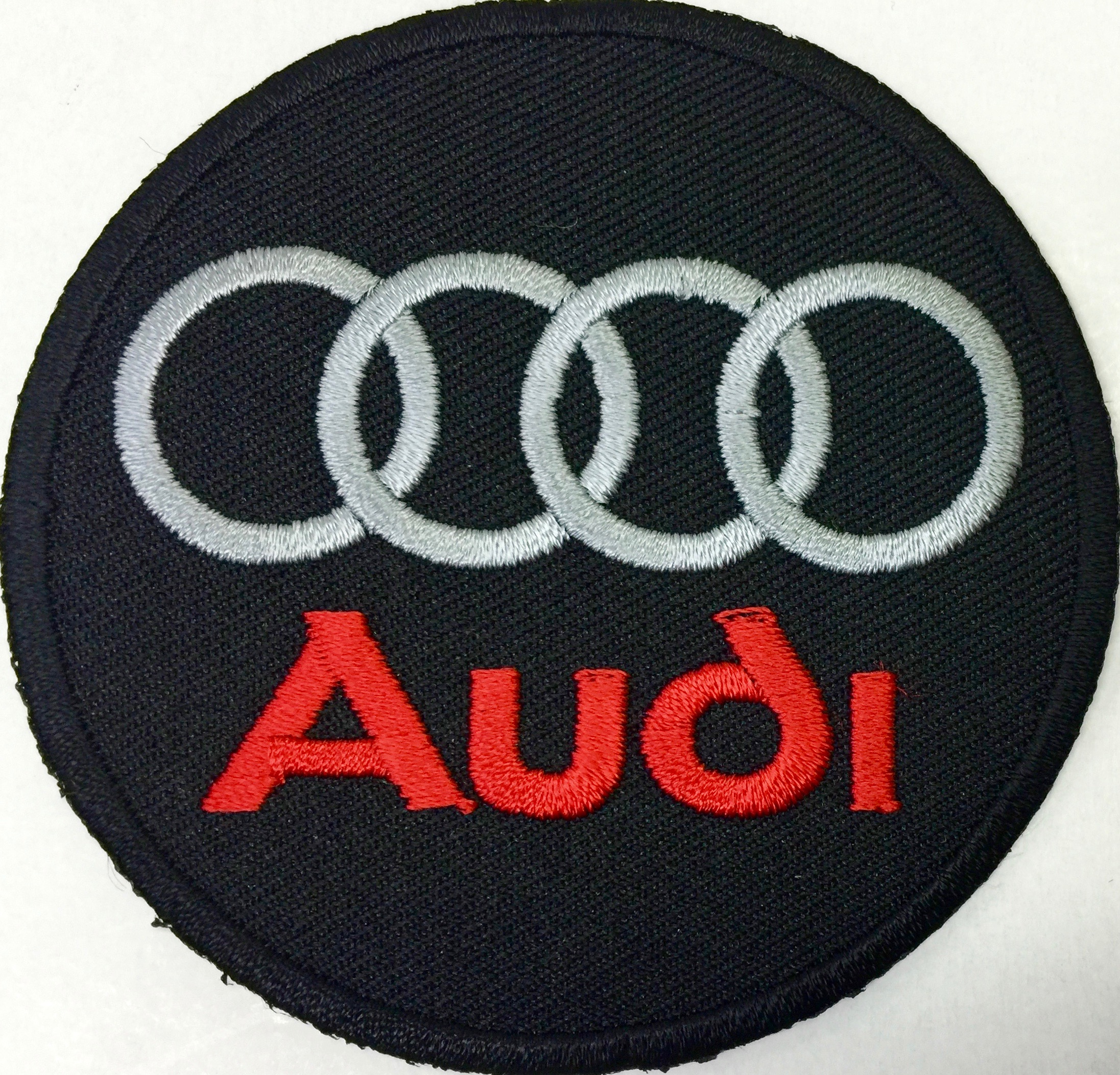 Kangasmerkki, Audi. Merkin halkaisija 7,5 cm. Merkin voi kiinnittää joko ompelemalla tai silittämällä.