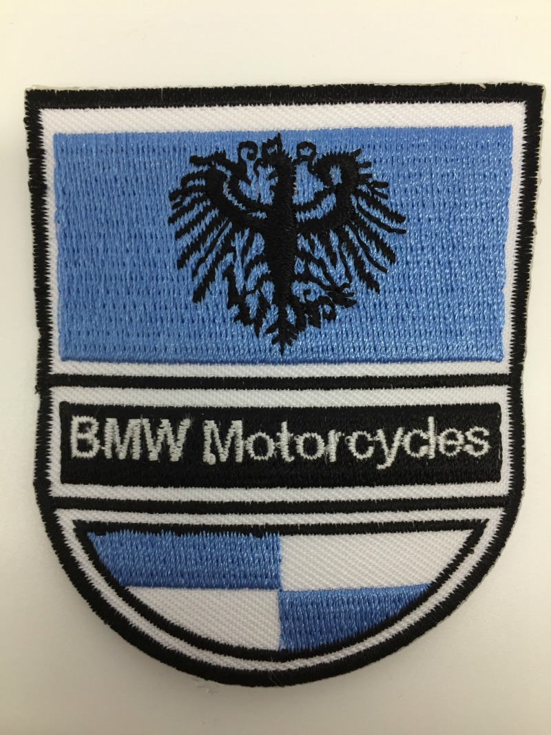 Kangasmerkki, BMW Motorcycles. Hihamerkin koko leveys 6,5 cm ja korkeus 7,5 cm. Merkin voi kiinnittää joko ompelemalla tai silittämällä.