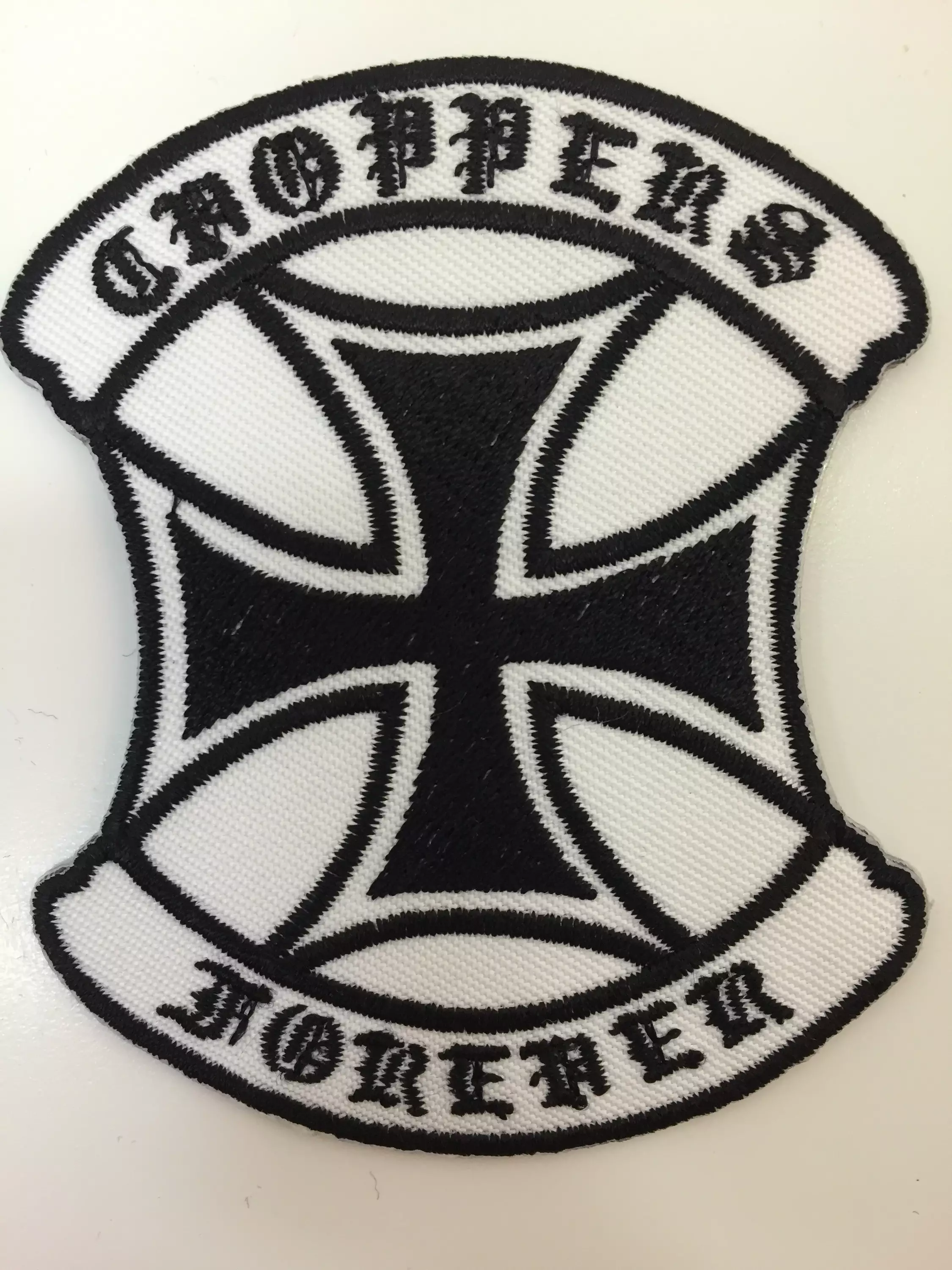 Kangasmerkki, Choppers Forever. Merkin koko 8 x 7 cm. Merkin voi kiinnittää joko silittämällä tai ompelemalla.