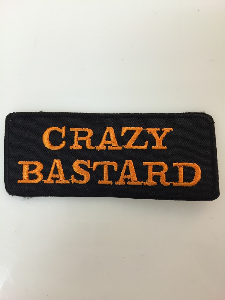 Kangasmerkki, Crazy Bastard. Merkin koko 8,5 x 3,5 cm. Merkin voi kiinnittää joko ompelemalla tai silittämällä.