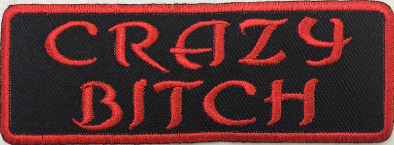 Kangasmerkki, crazy bitch. Merkin koko 10,5 x 4 cm.