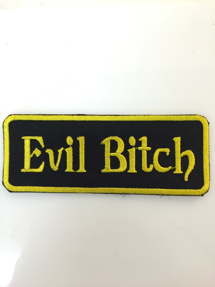 Kangasmerkki, Evil Bitch. Merkin koko 10 x 4 cm. Kangasmerkin voi kiinnittää joko ompelemalla tai silittämällä.