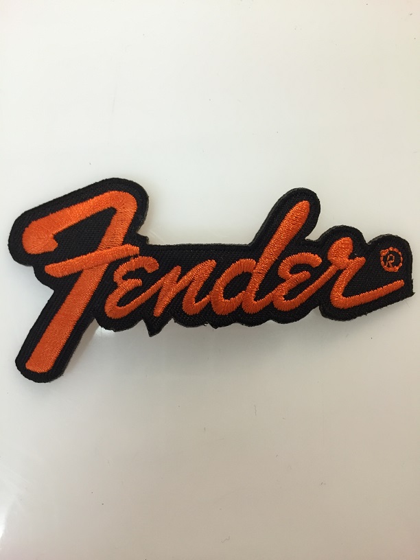 Kangasmerkki, Fender. Merkin koko leveys 9 cm ja korkeus 4,5 cm. Merkin voi kiinnittää joko ompelemalla tai silittämällä.