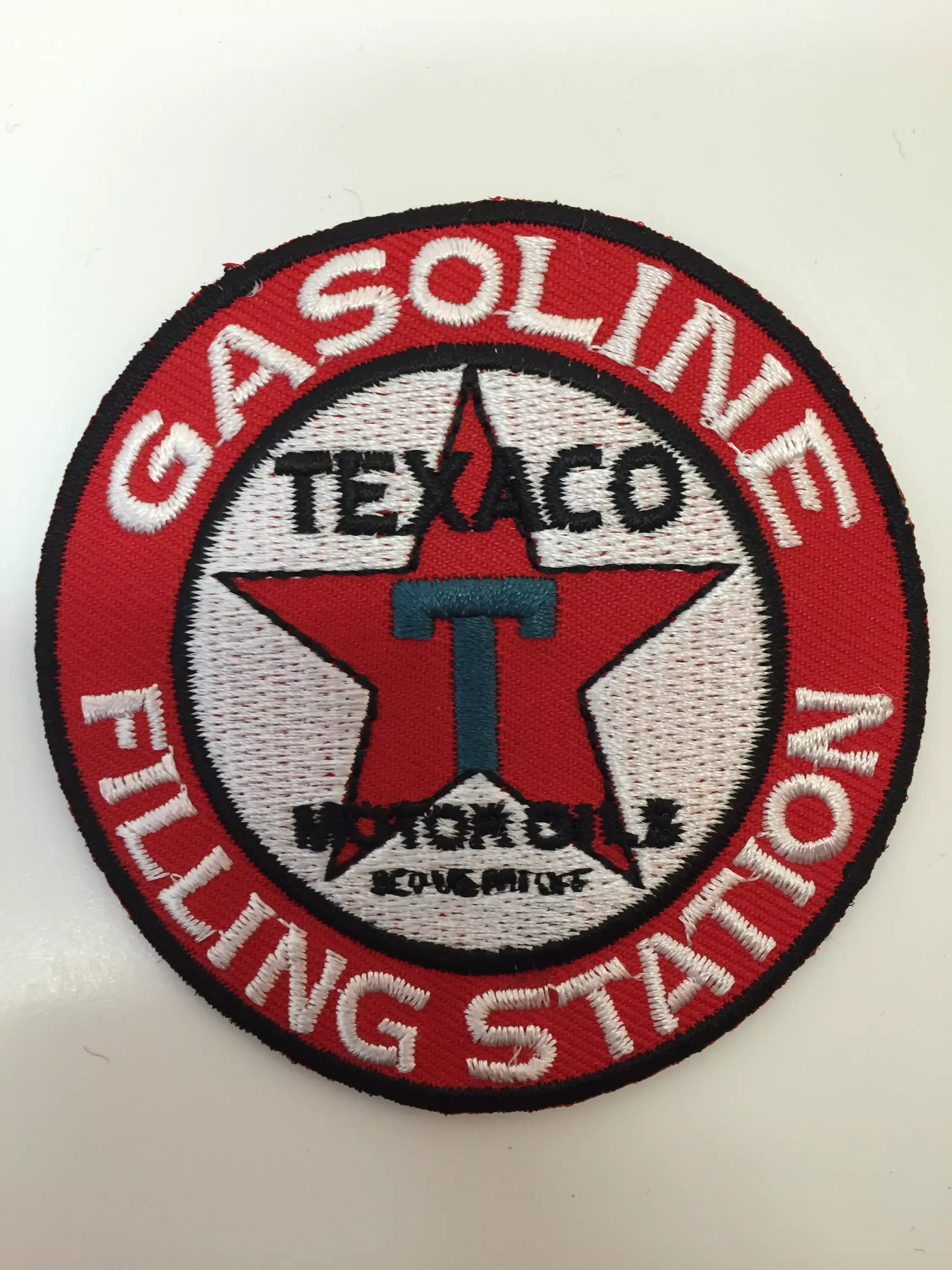 Kangasmerkki, Gasoline Station. Merkin halkaisija 7 cm. Merkin voit kiinnittää joko ompelemalla tai silittämällä.