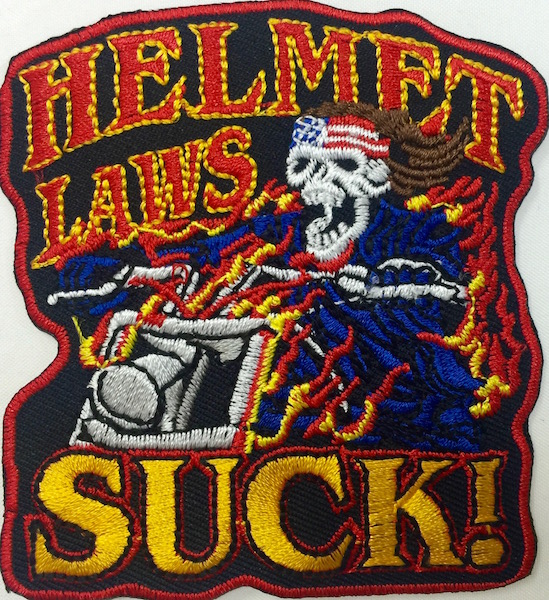 Kangasmerkki, Helmet law suck! Merkin koko 7 x 8 cm. Merkin voi kiinnittää joko ompelemalla tai silittämällä.