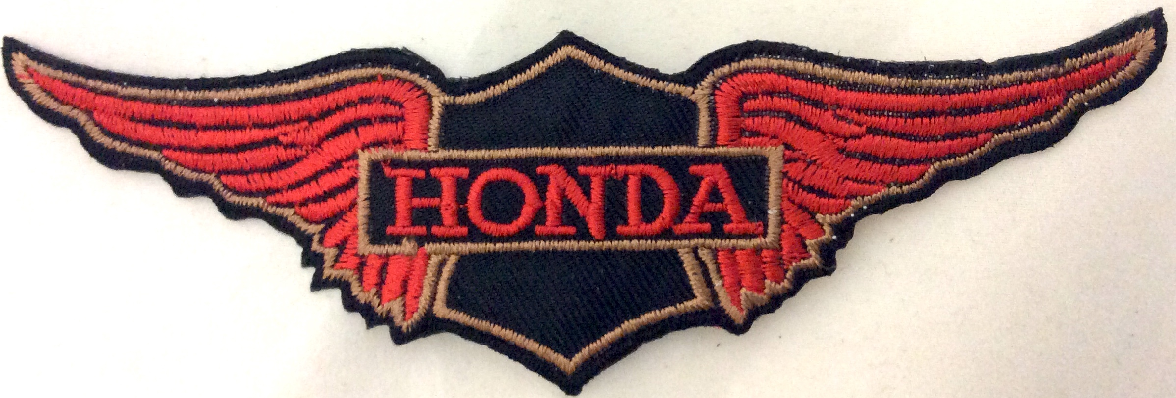 Kangasmerkki, Honda siivet punamus ta . Merkin koko 13,5x4,5 cm. Merkin takana kuumaliima. Merkin voi kiinnittää joko ompelemalla tai silittämällä.
