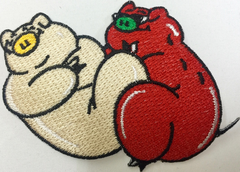 Kangasmerkki, kaksi possua. Merkin koko 7 x 5,5 cm.