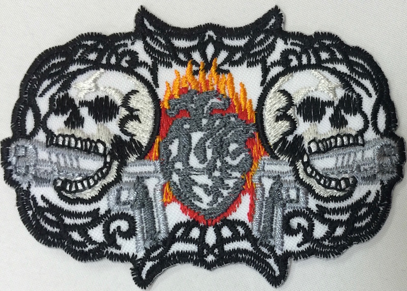 Kangasmerkki, Kallot ja aseet. Merkin koko 8,5 x 6 cm.