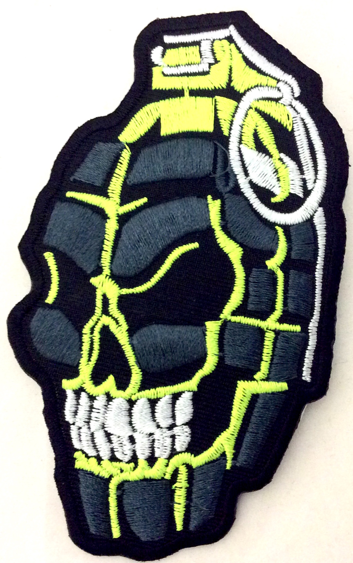 Kangasmerkki, Käsikranaatti kallo, kelt . Merkin koko 6x10,5 cm. Merkin takana kuumaliima. Merkin voi kiinnittää joko ompelemalla tai silittämällä.