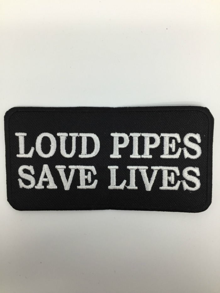 Kangasmerkki, Loud pipes save lives. Hihamerkin koko n. leveys 10,5 cm ja korkeus 5,5 cm. Merkin voi kiinnittää joko ompelemalla tai silittämällä.