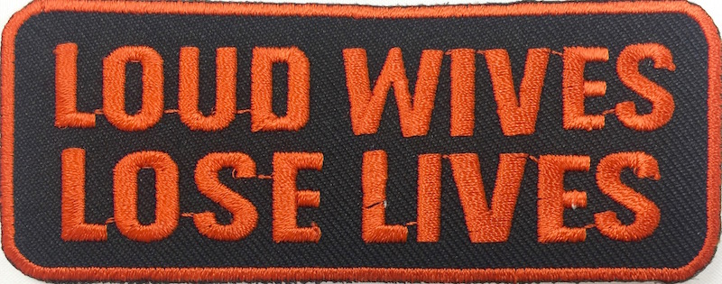 Kangasmerkki, Loud wives, lose lives. Merkin koko 10 x 4 cm. Merkin voi kiinnittää joko ompelemalla tai silittämällä.
