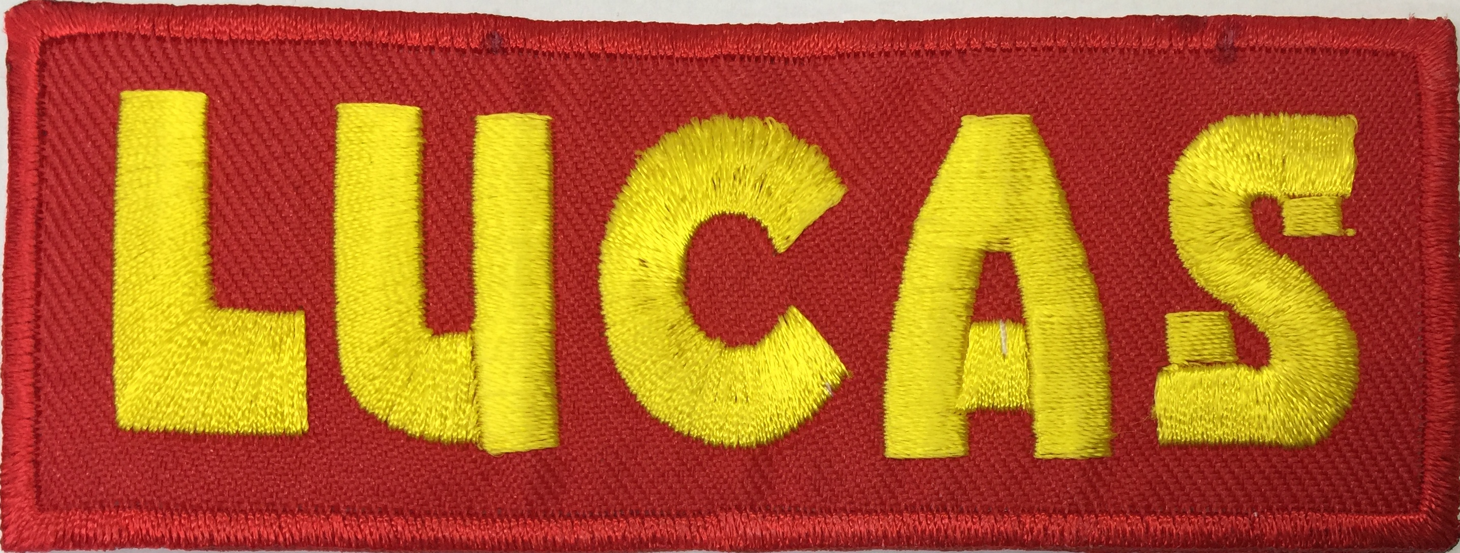 Kangasmerkki, Lucas. Merkin koko 10 x 3,5 cm. Merkin voi kiinnittää joko ompelemalla tai silittämällä.
