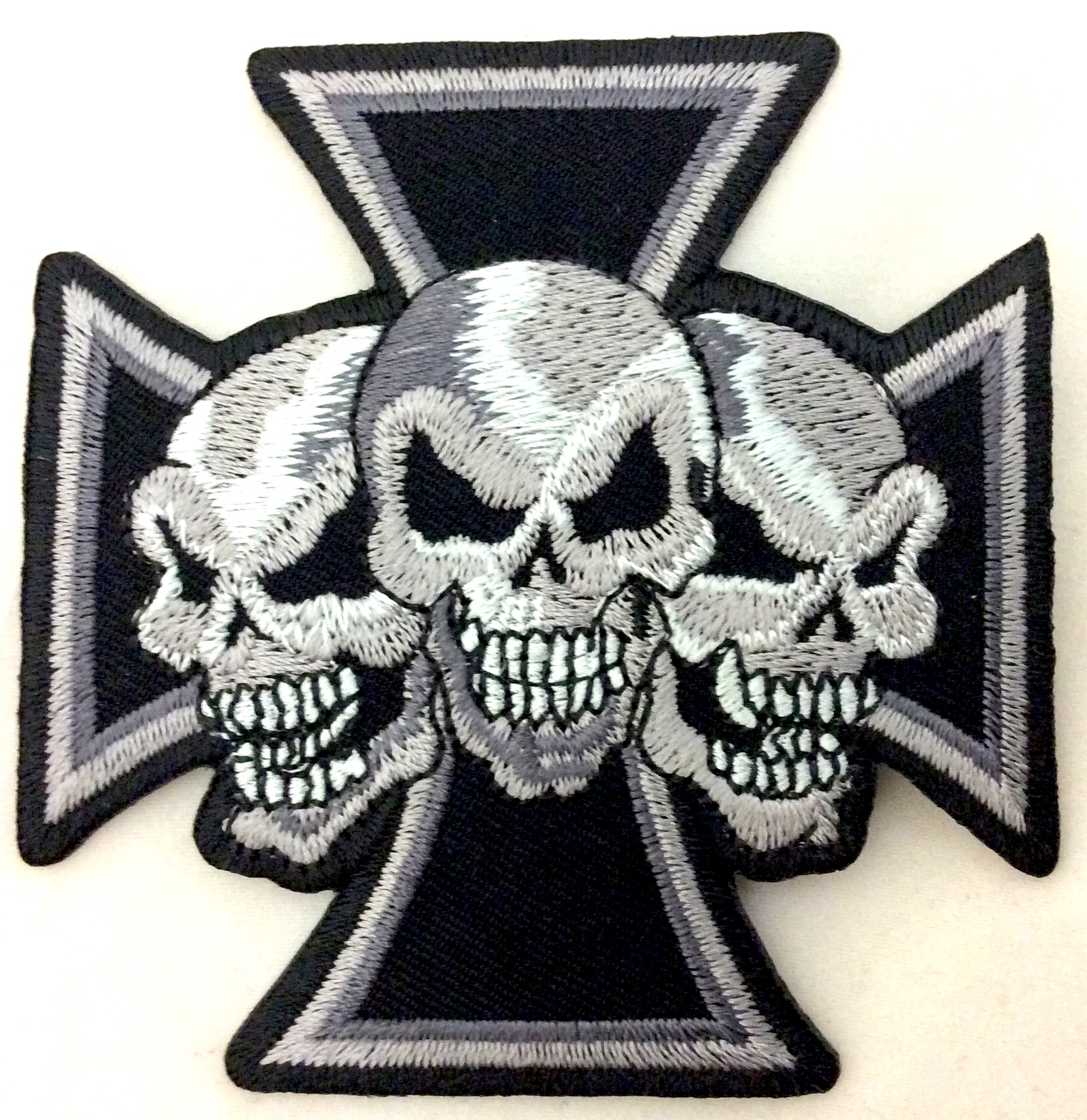 Kangasmerkki, Maltanristi ja 3 kalloa . Merkin koko 8x8,5 cm. Merkin takana kuumaliima. Merkin voi kiinnittää joko ompelemalla tai silittämällä.