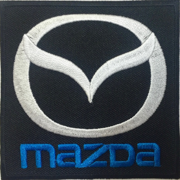 Kangasmerkki, Mazda. Merkin koko 8 x 8 cm. Merkin voi kiinnittää joko ompelemalla tai silittämällä.