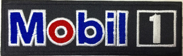 Kangasmerkki, Mobil 1. Merkin koko 12 x 3,5 cm. Merkin voi kiinnittää joko ompelemalla tai silittämällä.