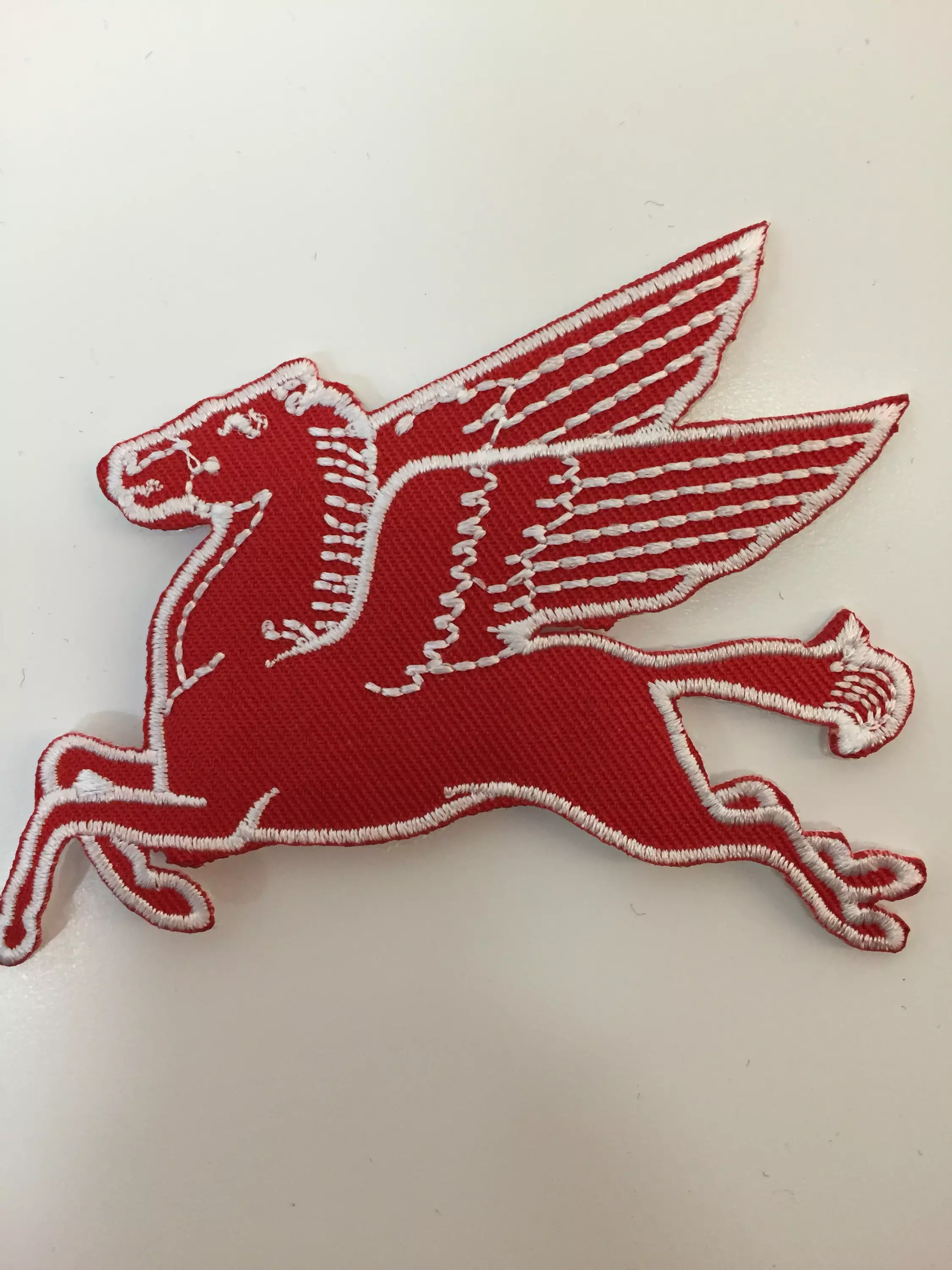 Kangasmerkki, Mobilgas. Merkin koko 9 x 7 cm. Merkin voi kiinnittää joko ompelemalla tai silittämällä.