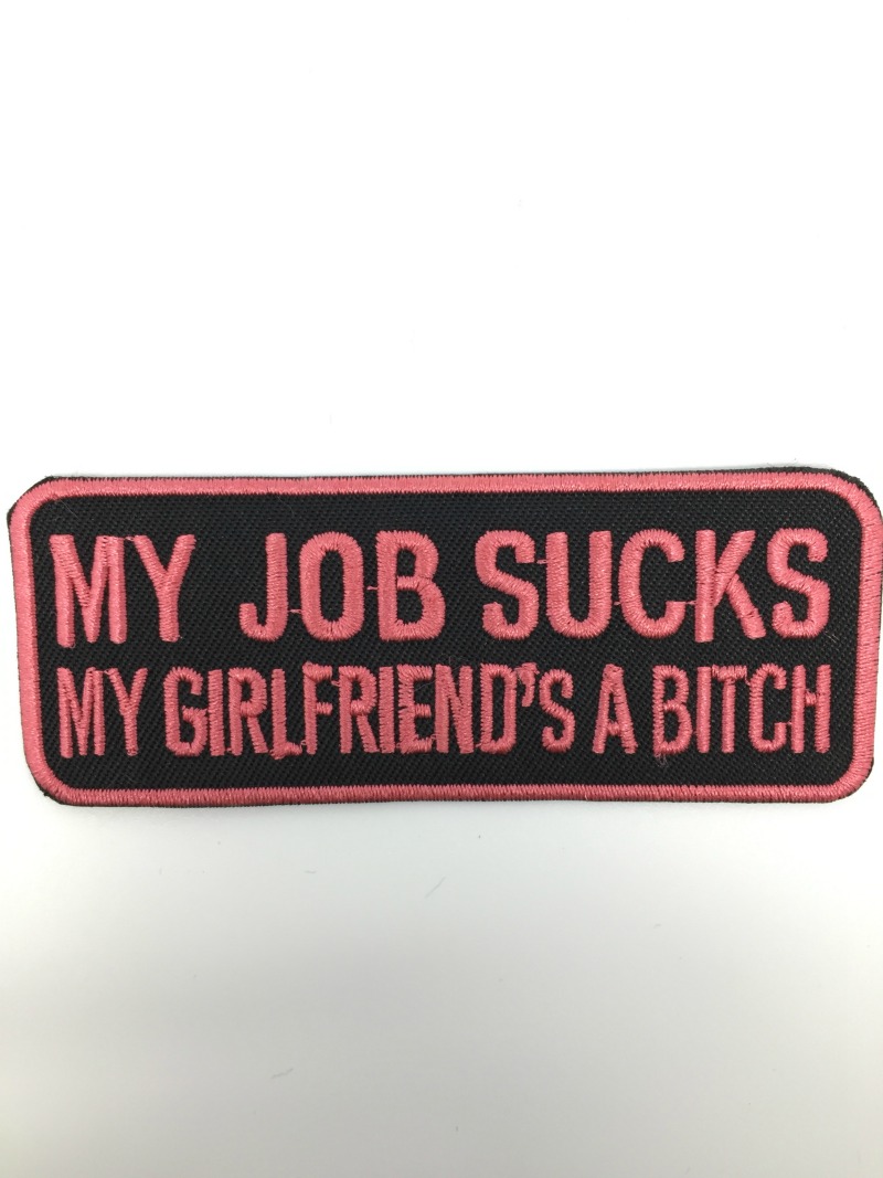 Kangasmerkki, My job sucks. Hihamerkin koko n. leveys 9,5 cm ja korkeus 3,5 cm. Merkin voi kiinnittää joko ompelemalla tai silittämällä.