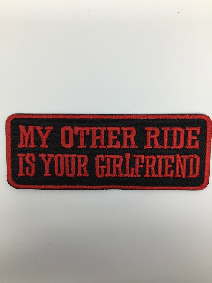 Kangasmerkki, My other ride is your girlfriend. Hihamerkin koko leveys 10,5 cm ja korkeus 4 cm. Merkin voi kiinnittää joko ompelemalla tai silittämällä.