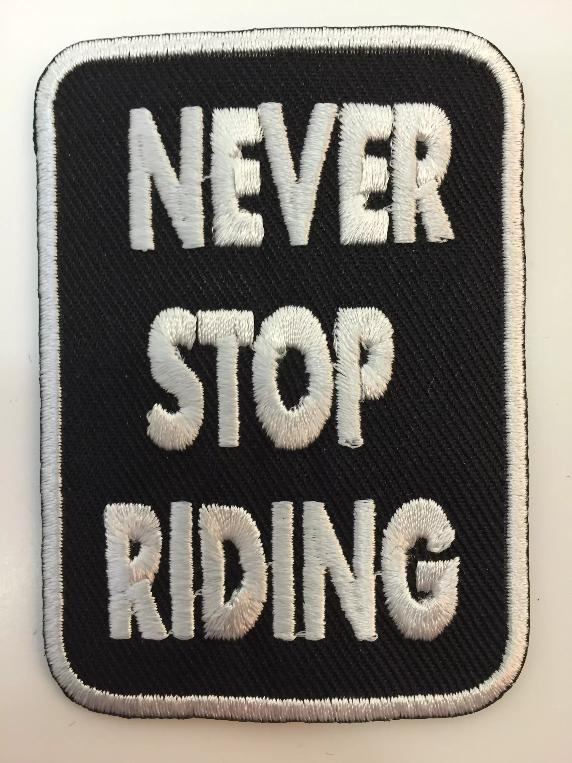 Kangasmerkki, Never Stop Riding. Merkin koko n. 5 x 7 cm. Merkin voi kiinnittää joko silittämällä tai ompelemalla.
