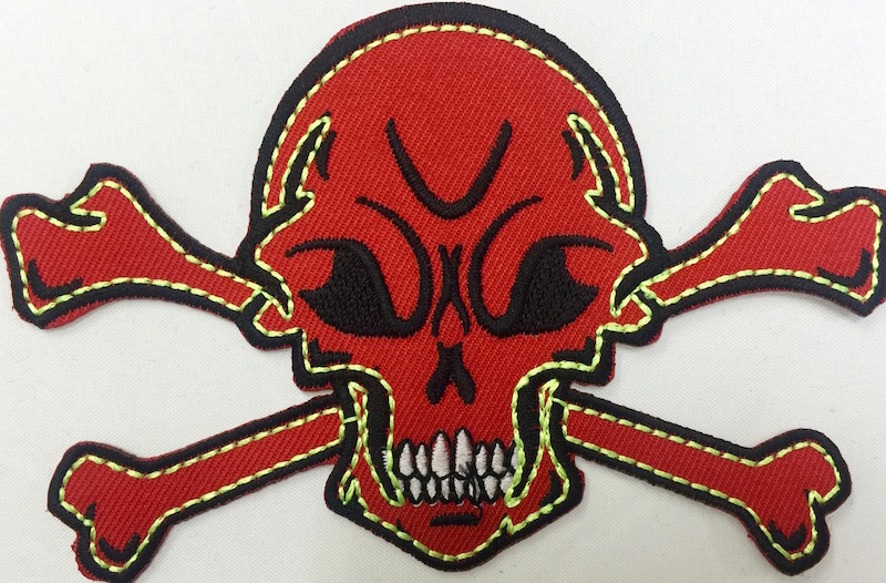 Kangasmerkki, Pääkallo, punainen. Merkin koko 11 x 7,5 cm.