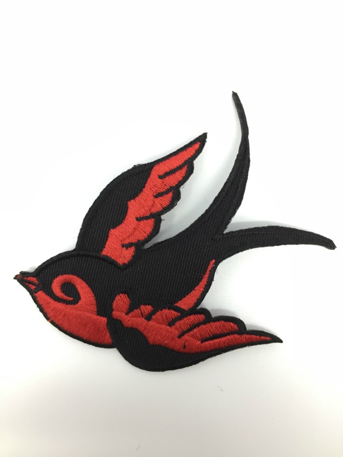 Kangasmerkki, Pääsky . VASEN. Merkin koko n. 10 x 6 cm. Merkin voi kiinnittää joko ompelemalla tai silittämällä.
