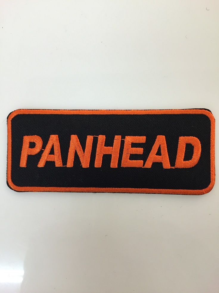 Kangasmerkki, Panhead. Merkin koko n. 10 x 4 cm. Kangasmerkin voi kiinnittää joko ompelemalla tai silittämällä.