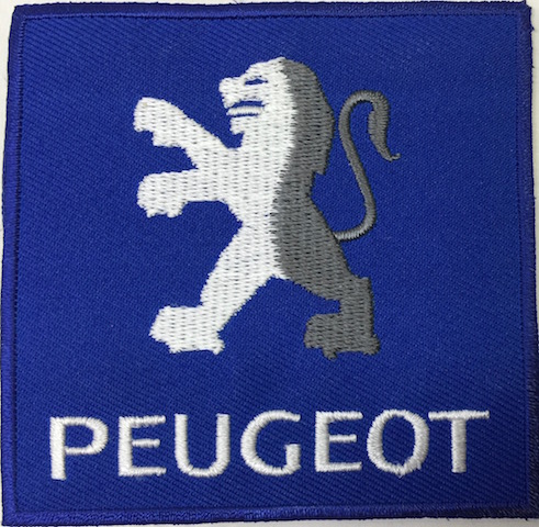 Kangasmerkki, Peugeot. Merkin koko 7,5 x 7,5 cm. Merkin voi kiinnittää joko ompelemalla tai silittämällä.