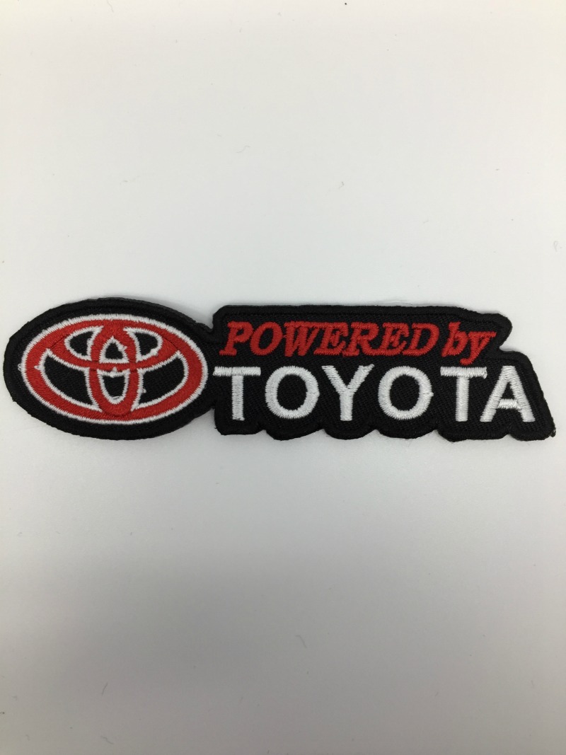 Kangasmerkki, Powered by Toyota. Hihamerkin koko n. leveys 11 cm ja pituus 3 cm. Merkin voi kiinnittää joko ompelemalla tai silittämällä.