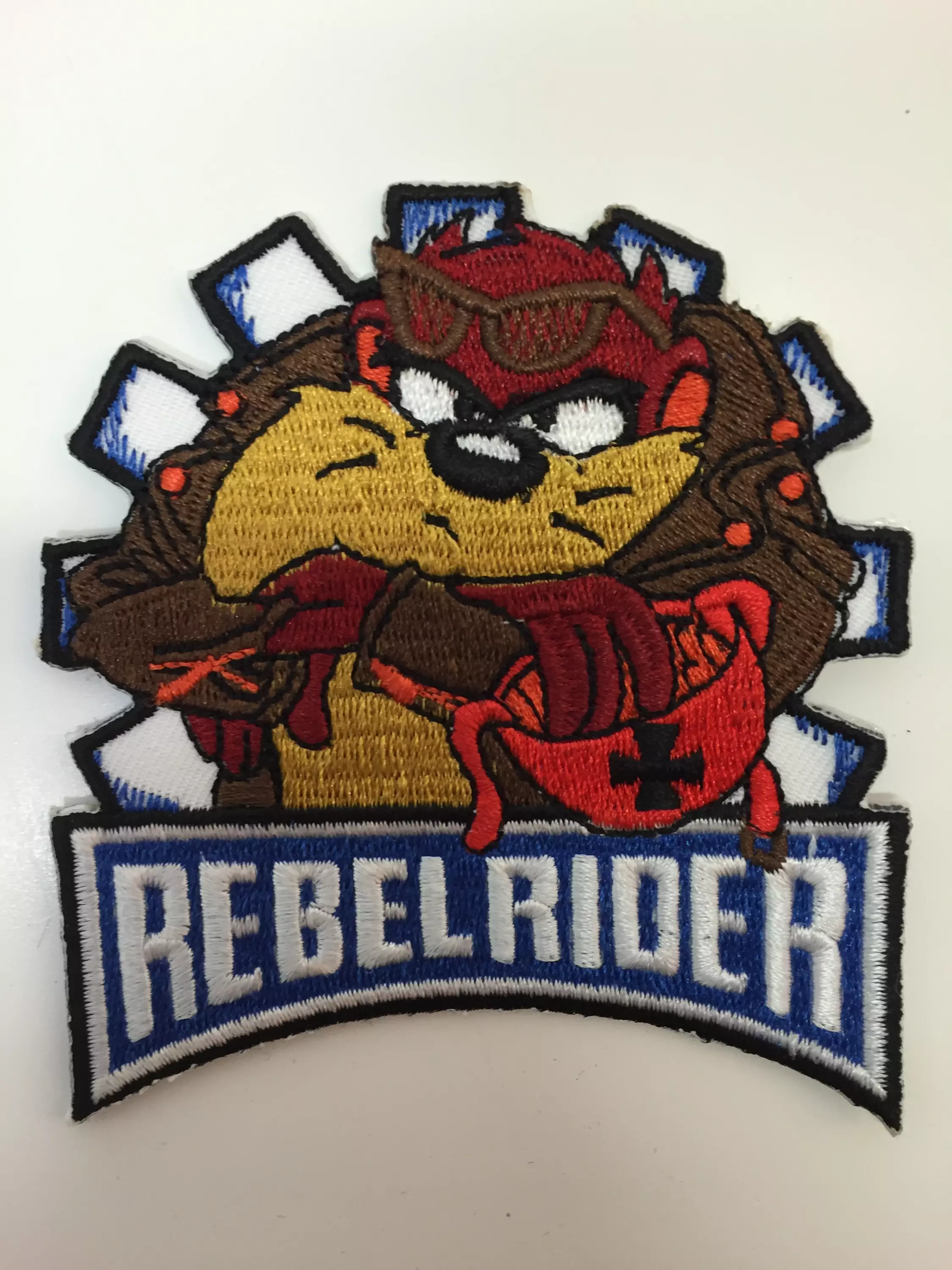 Kangasmerkki, Rebel Rider. Merkin koko n. 8 x 8,5 cm. Merkin voi kiinnittää joko ompelemalla tai silittämällä.