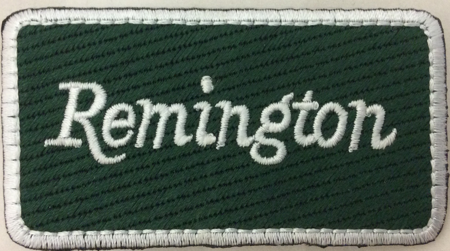 Kangasmerkki, Remington . Merkin koko 8x4,3 cm. Merkin takana kuumaliima. Merkin voi kiinnittää joko ompelemalla tai silittämällä.
