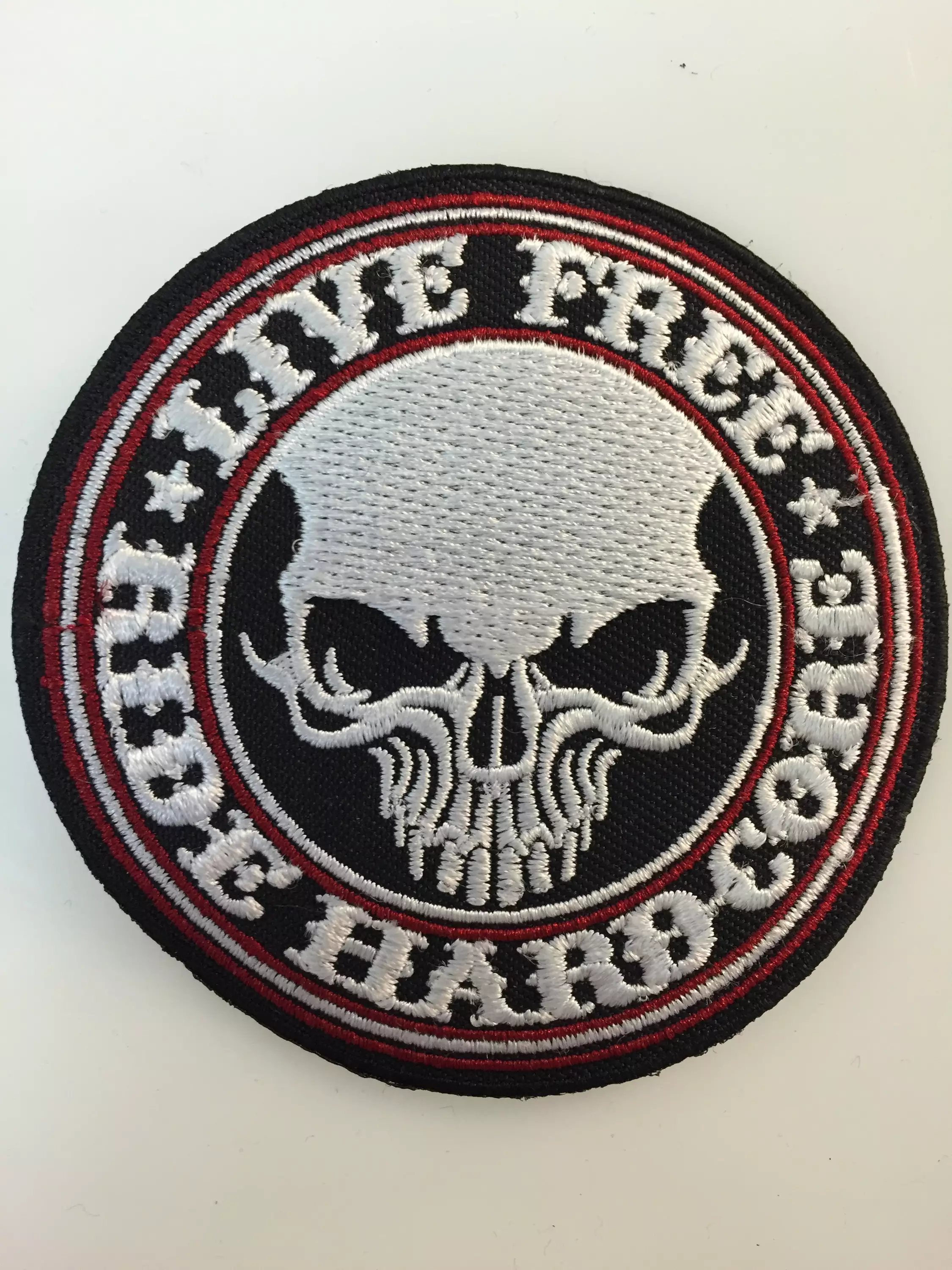 Kangasmerkki, Ride Hardcore. Merkin halkaisija 7,5 cm. Merkin voi kiinnittää joko ompelemalla tai silittämällä.