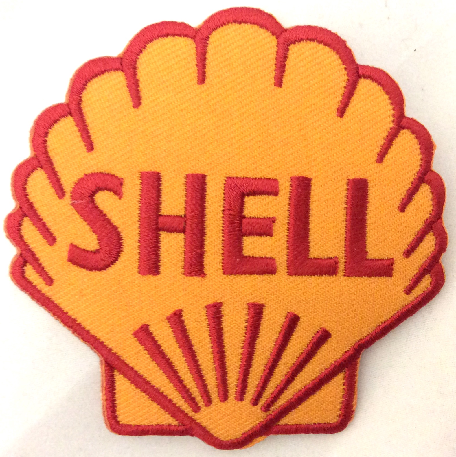 Kangasmerkki, Shell punaoranssi . Merkin koko 6,5x7,5 cm. Merkin takana kuumaliima. Merkin voi kiinnittää joko ompelemalla tai silittämällä.