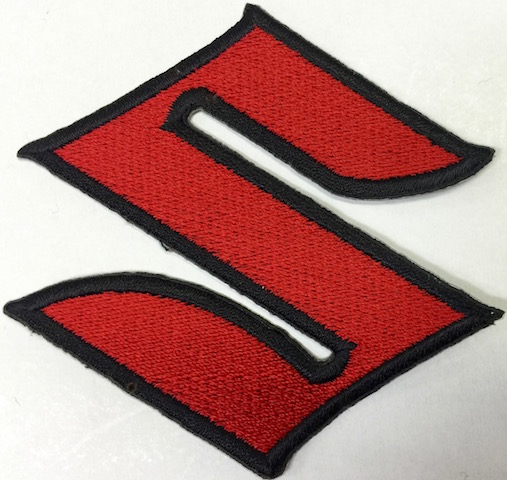 Kangasmerkki, Suzuki. Merkin koko 7 x 7 cm. Merkin voi kiinnittää joko ompelemalla tai silittämällä.