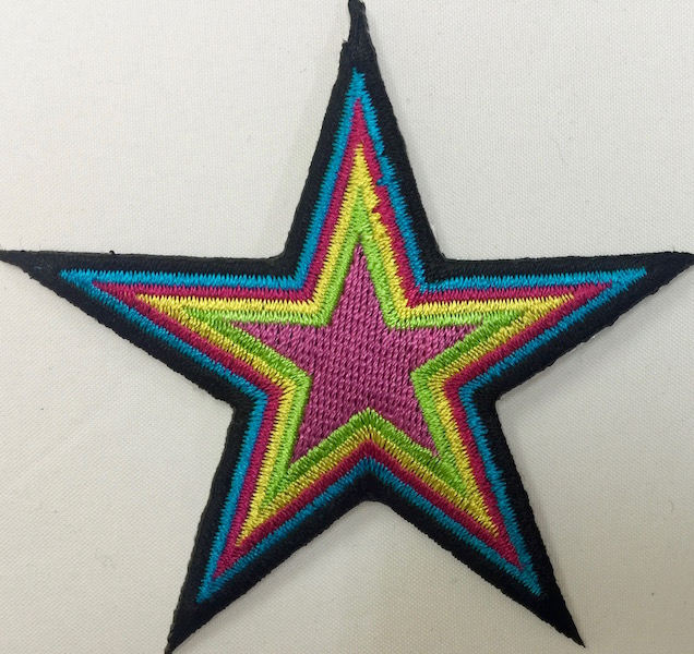 Kangasmerkki, värikäs tähti. Merkin koko 8 x 8 cm.