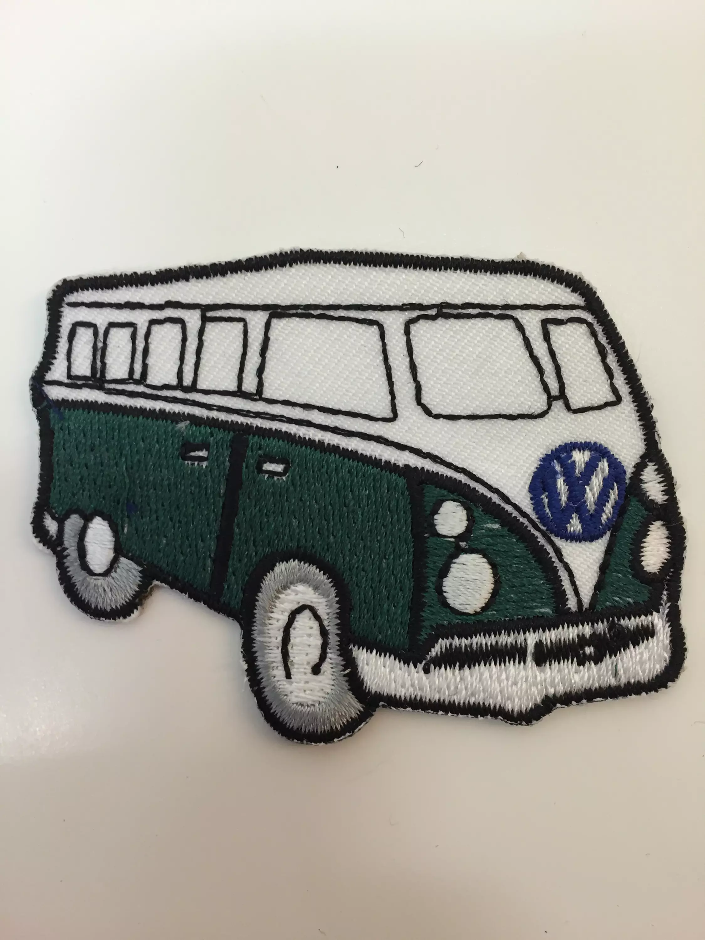 Kangasmerkki, VW Kleinbus, vihreä. Merkin koko 6,5 x 5 cm. Merkin voi kiinnittää joko ompelemalla tai silittämällä.