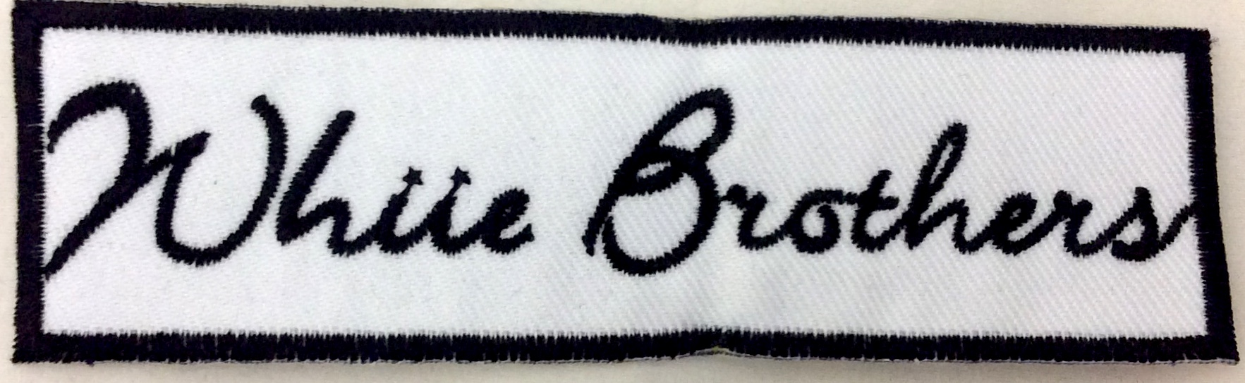Kangasmerkki, White Brothers. Merkissä lukee Whue Brothers. Merkin koko 11,5x3,5 cm. Merkin takana kuumaliima. Merkin voi kiinnittää joko ompelemalla tai silittämällä.