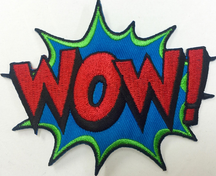 Kangasmerkki, WOW! Merkin koko 9 x 7 cm. Merkin voi kiinnittää joko ompelemalla tai silittämällä.