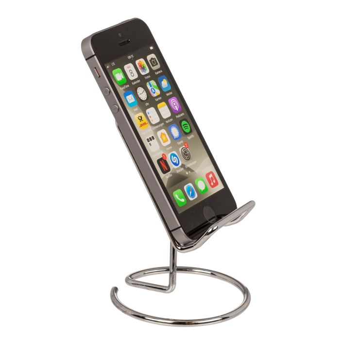 Kännykkäteline, n. 10 x 8 cm. Teräksenvärinen pöytäteline matkapuhelimelle.