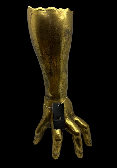 Käsi patsas/ maljakko, antiikkikulta. Hand Vase, 16 cm x 33 cm. Tyylikäs antiikkikullanvärinen Hand-maljakko, jonka voi halutessaan kääntää toisinpäin, jolloin se toimii käsipatsaana. Patsaaseen voi ripustaa vaikka koruja, tai sisustaa sillä ihan sellaisenaan. Materiaali polyresiini.