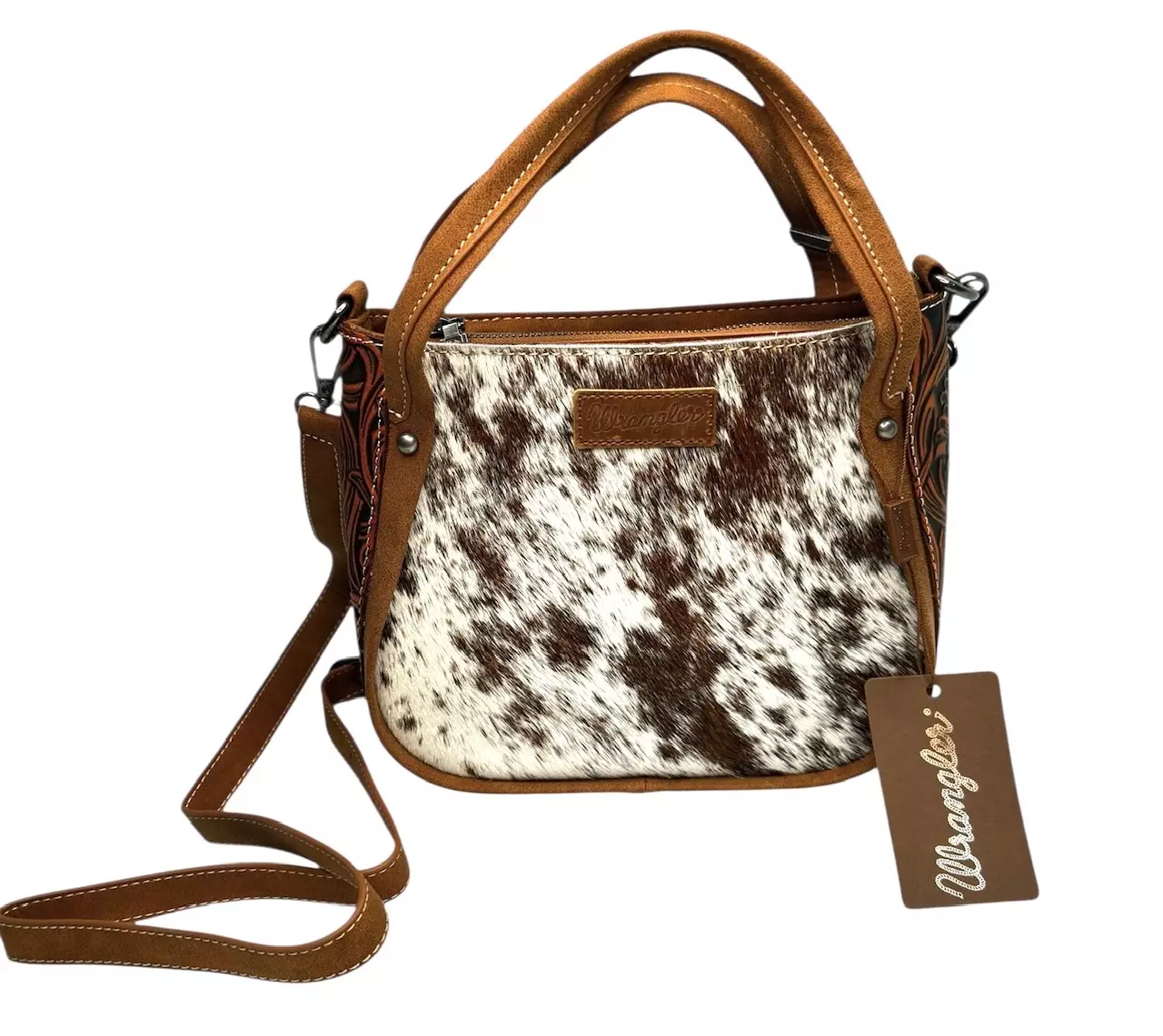 Käsilaukku Cow, Wrangler. Ruskea vetoketjullinen laukku, jonka etupuoli aitoa naudannahkaa. Laukun mitat 25 x 21 x 9,5 cm.