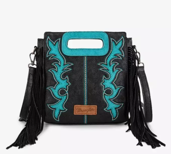 Wrangler-käsilaukku hapsuilla ja koristekuvioinneilla, mustaturkoosi. Laukku suljetaan kahdella magneettinepparilla. Edessä pieni nahkainen Wrangler-logo. Laukun toisella puolella vetoketjullinen tasku. Laukun vuorissa on myös yksi vetoketjullinen ja yksi avotasku. Mitat 21 x 24 x 8 cm. Laukussa on mukana irroitettava, säädettävä olkahihna. Materiaali polyuretaani ja nahka. Vuori polyesteria.