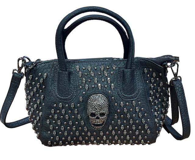 Käsilaukku, iso kimallekallo metallista. Mitat 25,5 x 22 x 10 cm. Keinonahkainen, näyttävä käsilaukku, jossa etu- ja sivuosat koristeltu pallo- ja pääkalloniiteillä. Lisäksi laukun etupuolella on katseenvangitsijana iso metallinen pääkallokoriste. laukum sisäpuolella tyyli jatkuu ja vuori on mustavalkoista pääkallokuvioista kangasta. Vuorissa on kaksi avotaskua, sekä yksi vetoketjullinen tasku pikkutavaroille. Laukussa on mukana irroitettava olkahihna, jonka pituus on säädettävissä.