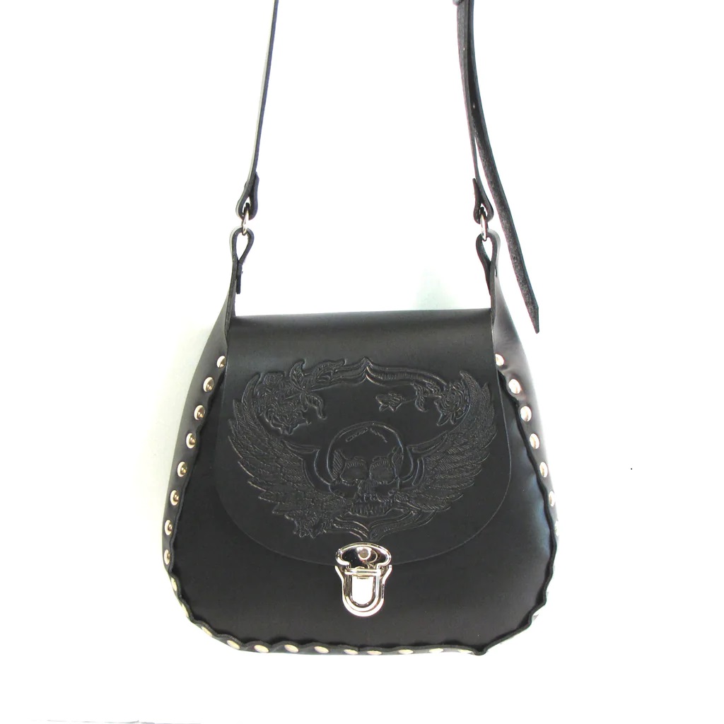 Käsilaukku, kallo ja siivet, aitoa nahkaa. Musta, kovarakenteinen käsilaukku, jonka kansiläpän nahkaan painettu siipikallo-kuvio. Laukkua reunustaa krominväriset niitit sekä etu-, että takapuolella. Laukun mitat 25 cm x 23 cm x 8 cm.