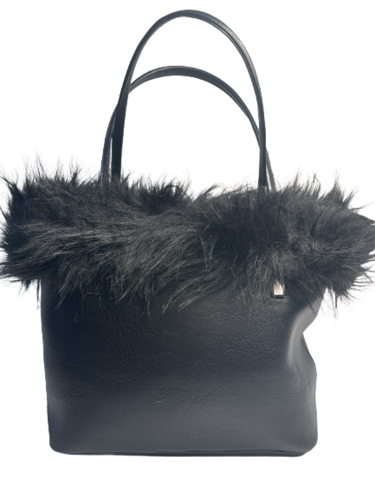 Käsilaukku irroitettavalla olkahihnalla. Musta karvareuna jonka voi napata netppareista irti. Hyvät taskut lompakolle, avaimille ja puhelimelle, etc.