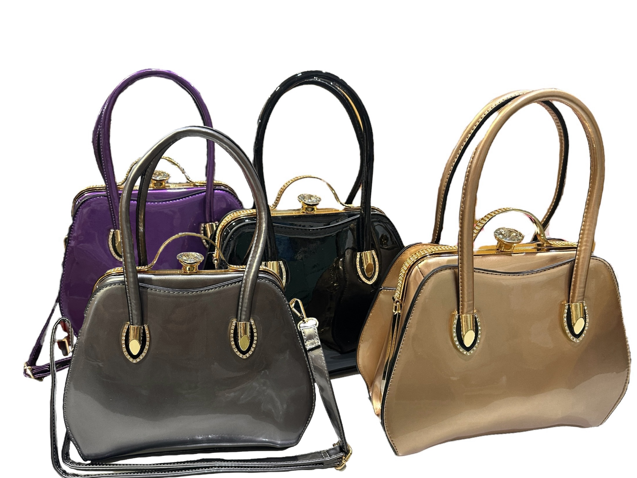 Käsilaukku Luxury. Laukussa kiinteät kantokahvat, mukana lisäksi irroitettava olkahihna. Kiiltävä keinonahkalaukku kimaltavin yksityiskohdin.