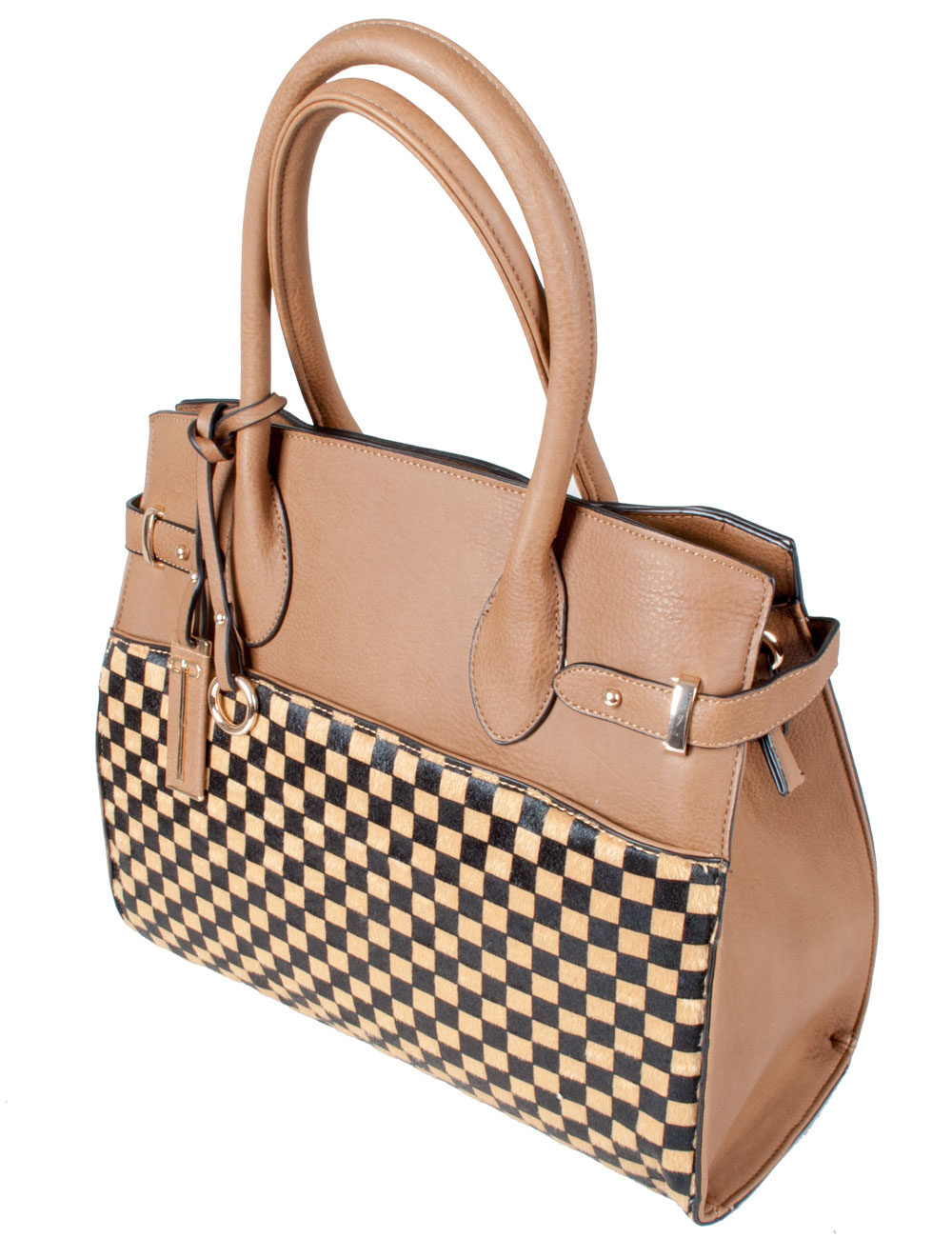 Käsilaukku, Ruutukuvio, Khaki, Korkeus: 30cm, leveys: 35cm ja syvyys 15cm.